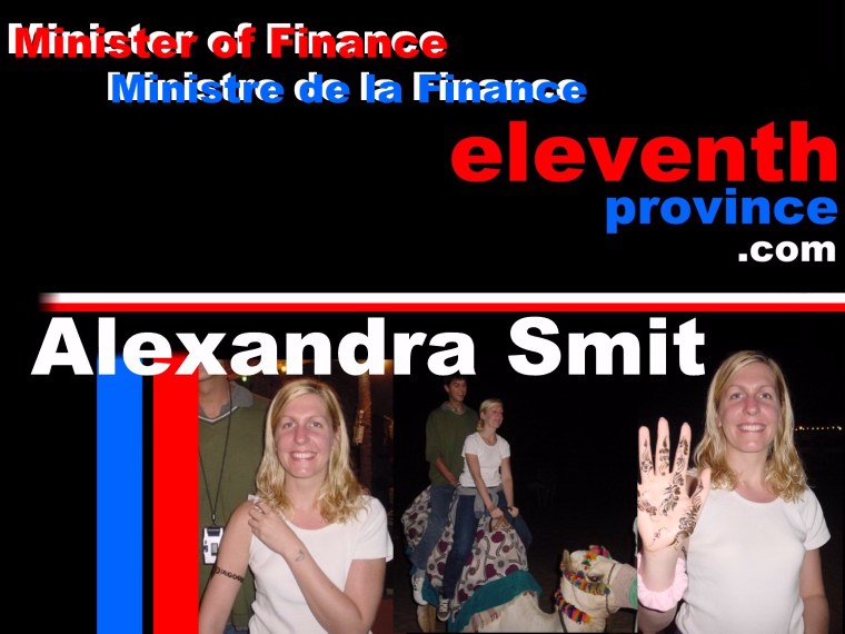 Minister Smit is now living happily sharing her time equally between London and Winchester, the home of her boyfriend, Anil, and of course now with eleventhprovince.com. It's great to have you on board Alexandra, I know you're going to make a great addition to the cabinet, not least because of the free Mars bars you're going to supply us with each week. Just please don't use any of the public coffers to pay back your outstanding student loan. Okay? Please don't look at me like that. Sorry, I didn't mean it - please don't call your Uncle Marco - PLEASE!