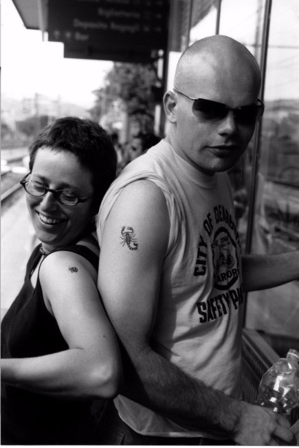 Gill & Nick show off their tattoos at San Bartolomeo station, Italy.